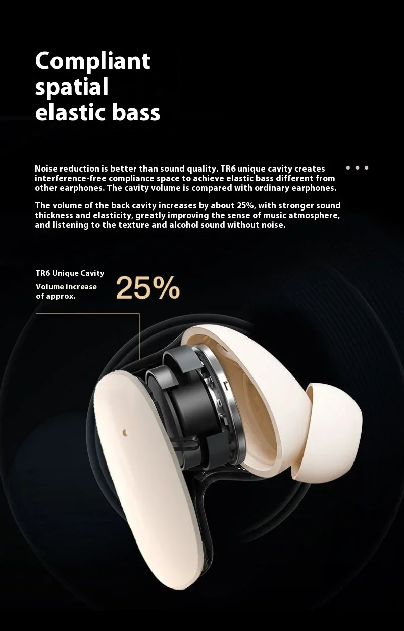 Noise reduction provides better sound quality, and the TR6's unique cavity creates interference free and smooth space, achieving elastic bass that sets it apart from other headphones. The cavity volume is about 25% larger than that of ordinary headphones, with stronger sound thickness and elasticity, greatly enhancing the music atmosphere and providing a high-quality listening experience in a noise free environment